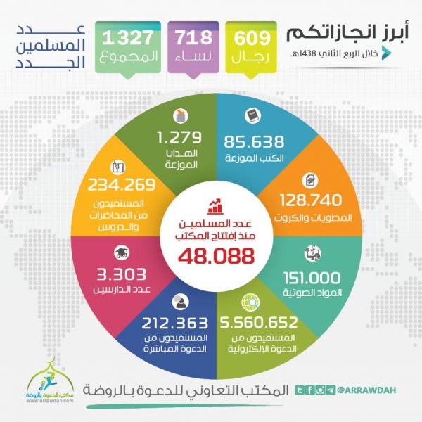 شهد المكتب التعاوني للدعوة والإرشاد وتوعية الجاليات بالروضة خلال الربع الثاني من العام الحالي 1438هـ عن إسلام (1.327) شخصاً من جنسيات مختلفة ، منهم (609) من الرجال و(719) من النساء، ليصبح اجمالي عدد المسلمين منذ افتتاح المكتب في العام 1413هـ أكثر من (48.000) مسلم وأسلمت تلك الأعداد عن طريق قسم الجاليات والقسم النسائي وموقع دين الإسلام (www.IslamReligion.com ) .
