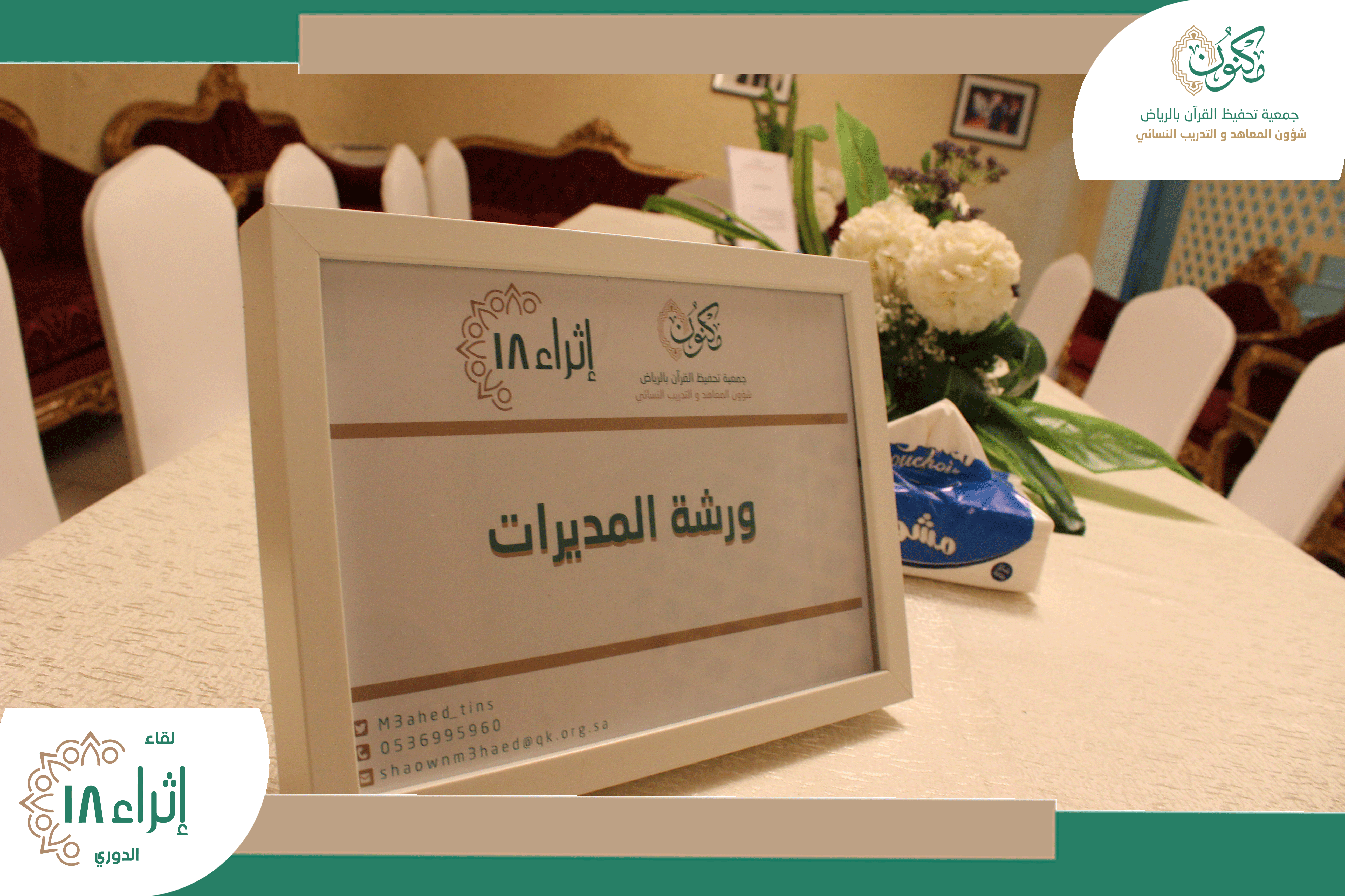 إكمالاً للقاءات السابقة التي تكللت بالنجاح، وانطلاقا من خطة الشؤون التعليمية، وتحقيقاً لهدف تعزيز اللقاءات المهنية، أقام مكتب شؤون المعاهد والتدريب النسائي بجمعية تحفيظ القرآن بالرياض (مكنون)، اللقاء الدوري الثامن عشر ( إثراء ١٨) بقاعة محمد الخضير الثقافية بمدارس التربية النموذجية بحي الريان، يوم الخميس ٢٦ /٣/ ١٤٣٩ هـ.