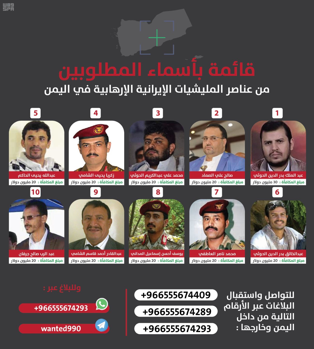 أعلنت المملكة عن أرقام التواصل للإبلاغ عن قائمة الـ ( 40 ) اسماً لقيادات وعناصر مسؤولة عن تخطيط وتنفيذ ودعم الأنشطة الإرهابية المختلفة في جماعة الحوثي الإرهابية، ورصدت مكافآت مالية ( موضحة أمام اسم كل منهم )، لمن يدلي بأي معلومات تُفضي إلى القبض عليهم أو تحديد أماكن وجودهم.