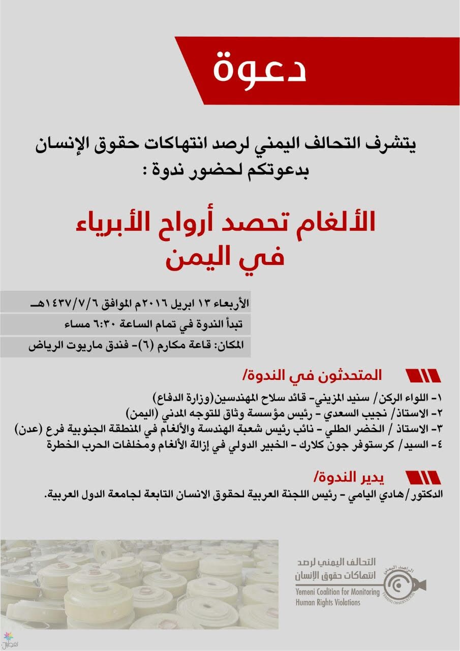 ينظم التحالف اليمني لرصد انتهاكات حقوق الانسان ندوة بعنوان ” الالغام تحصد ارواح الابرياء في اليمن ” الاربعاء المقبل ١٣ ابريل ٢٠١٦ الساعة ٦:٣٠ مساء بقاعة المكارم فندق الماريوت بالرياض