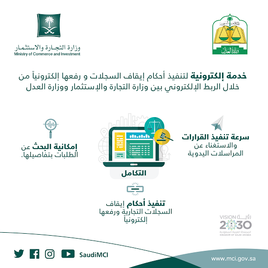 وستمكن خدمة التكامل الإلكتروني القضاة بوزارة العدل من تنفيذ حكم إيقاف السجلات التابعة للمدعى عليهم أو رفع قرارات الإيقاف حسب النظام بعد صدور قرار الحجز والتنفيذ عبر تزويد وزارة التجارة والاستثمار بالقرار إلكترونياً، ومن ثم تقوم “التجارة” بتأكيد التنفيذ بشكل فوري ودون أي تدخلات بشرية.