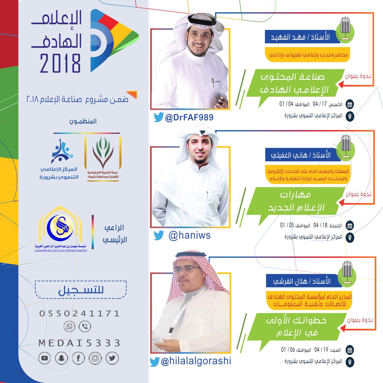 وسيشارك في تقديم ندوات الملتقى نخبة من المختصين في مجال الإعلام ( فهد الفهيد ، هاني الغفيلي ، هلال القرشي ) .