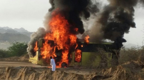 اندلع في حافلة مدرسية تقل 40 طالبة، صباح اليوم، أثناء ذهابهن لمدرستهن في محافظة المجاردة بمنطقة عسير، فيما أتى الحريق على الحافلة كاملة بعد فشل قائدها في إطفائه.