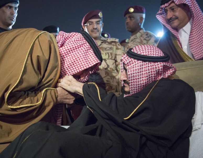 وكان في استقبال خادم الحرمين الشريفين عند سلم الطائرة فور وصوله – رعاه الله – بمطار قاعدة الملك سلمان الجوية بالقطاع الأوسط، صاحب السمو الملكي الأمير بندر بن عبدالعزيز آل سعود، وصاحب السمو الملكي الأمير عبدالإله بن عبدالعزيز آل سعود مستشار خادم الحرمين الشريفين، وصاحب السمو الملكي الأمير مقرن بن عبدالعزيز آل سعود، وصاحب السمو الملكي الأمير فيصل بن بندر بن عبدالعزيز أمير منطقة الرياض، وصاحب السمو الملكي الأمير سلطان بن سلمان بن عبدالعزيز رئيس الهيئة العامة للسياحة والتراث الوطني، وصاحب السمو الملكي الأمير محمد بن نايف بن عبدالعزيز ولي العهد نائب رئيس مجلس الوزراء وزير الداخلية، وصاحب السمو الملكي الأمير فيصل بن سلمان بن عبدالعزيز أمير منطقة المدينة المنورة، وصاحب السمو الملكي الأمير محمد بن سلمان بن عبدالعزيز ولي ولي العهد النائب الثاني لرئيس مجلس الوزراء وزير الدفاع، وصاحب السمو الملكي الأمير تركي بن محمد بن فهد بن عبدالعزيز، وصاحب السمو الملكي الأمير سلمان بن سلطان بن سلمان بن عبدالعزيز، وصاحب السمو الملكي الأمير عبدالمجيد بن عبدالإله بن عبدالعزيز، وصاحب السمو الملكي الأمير فيصل بن أحمد بن سلمان بن عبدالعزيز.