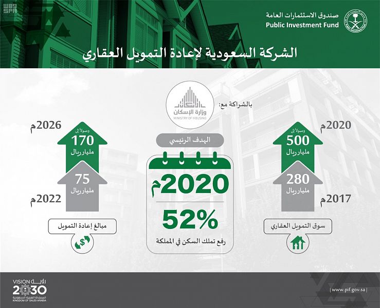 أعلن صندوق الاستثمارات العامة عن إنشاء الشركة السعودية لإعادة التمويل العقاري في المملكة، وذلك تماشياً مع رؤية المملكة 2030 الهادفة إلى تعزيز أداء القطاع العقاري، وزيادة مساهمته في الناتج المحلي الإجمالي، وزيادة فرص تملك السعوديين للسكن الملائم، وذلك بنسبة ستصل إلى 52% بنهاية عام 2020م .