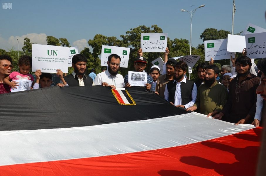 شهدت العاصمة الباكستانية إسلام آباد اليوم وقفة احتجاجية شارك فيها النشطاء والمحامون والمثقفون وعامة الشعب الباكستاني وأبناء الجالية اليمنية المقيمة في باكستان للتنديد بما تضمنه تقرير الأمم المتحدة من معلومات وبيانات مغلوطة بشأن الأطفال و النزاع المسلح في اليمن.