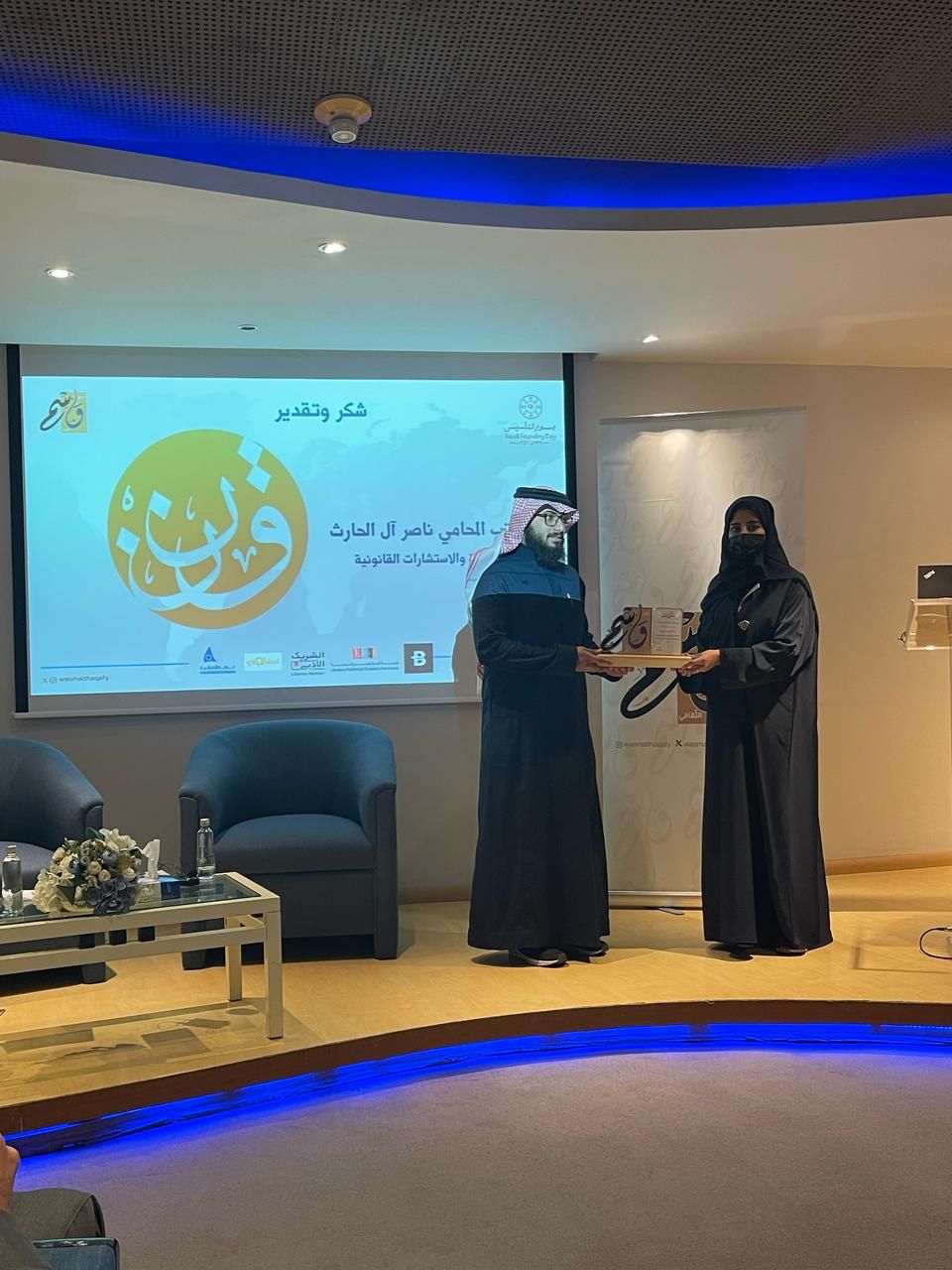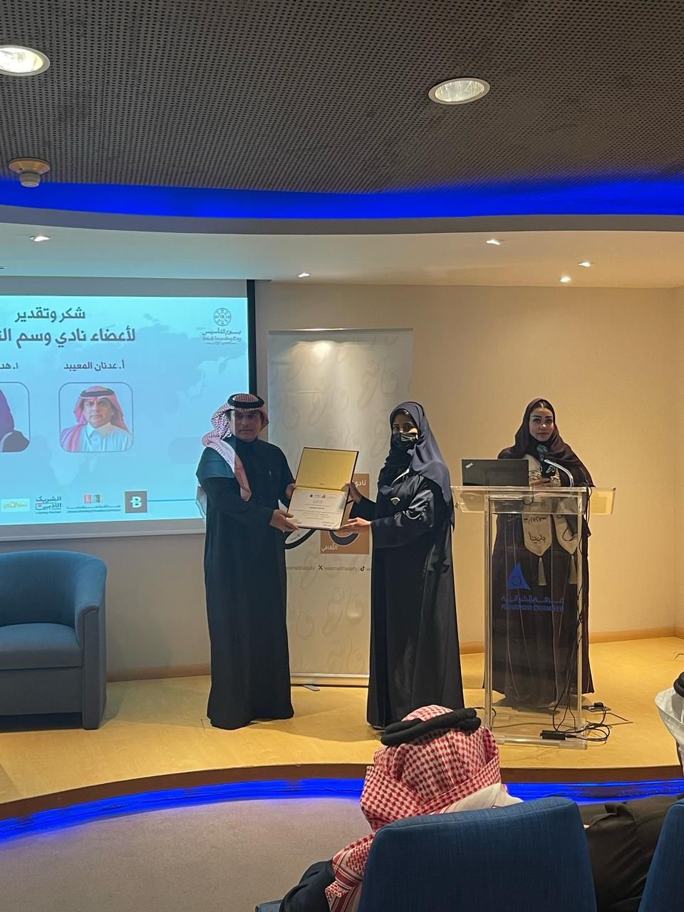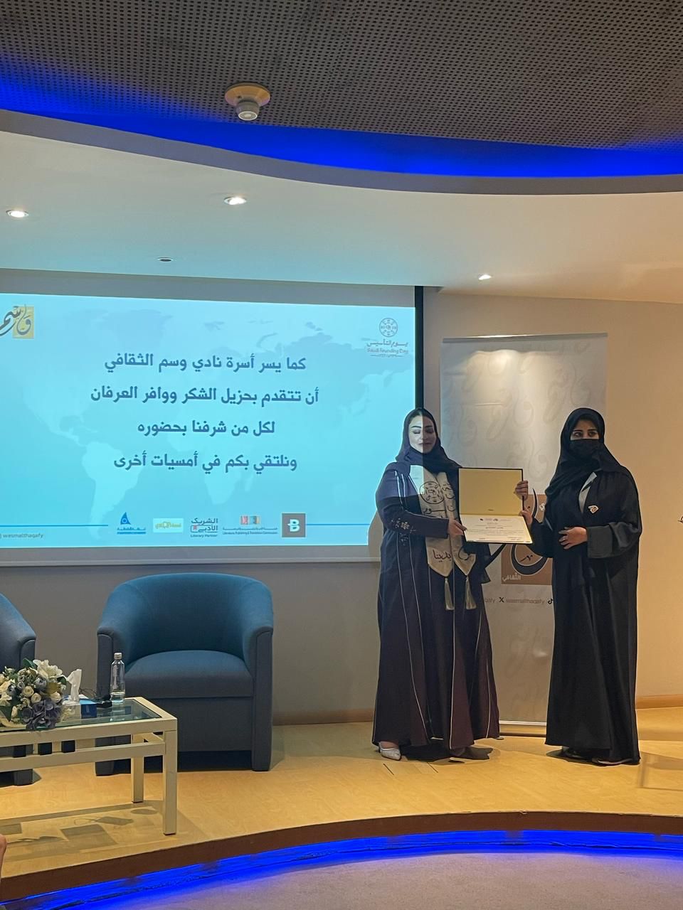 وفي ختام الأمسية قامت مديرة نادي وسم الثقافي الأستاذة عبير العبدالقادر بتكريم الأستاذعدنان المعيبد والأستاذ هدى الغامدي وكذلك تكريم عدد من الرعاه وشركاء النجاح وهم مقهى بروهيميان ومكتب المحامي ناصر آل الحارث للمحاماة والاستشارات القانونية.