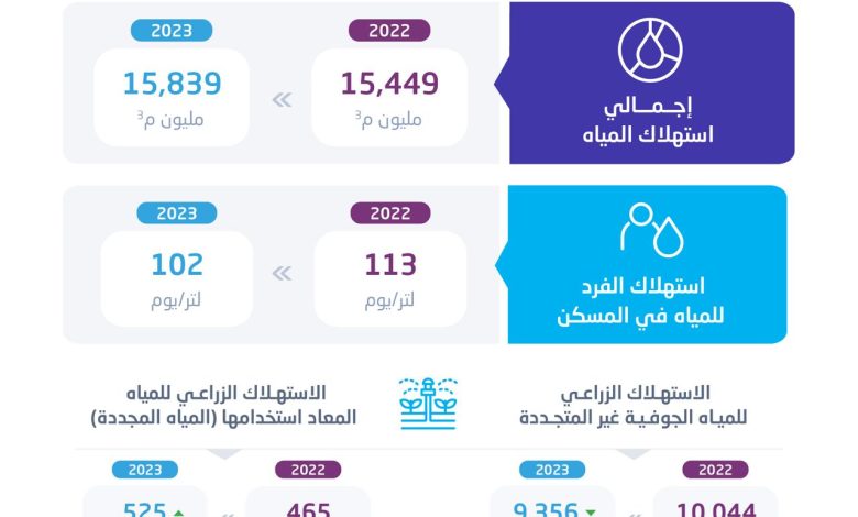 وأوضحت نتائج النشرة ارتفاع كمية إمدادات مياه البحر المحلاة في عام 2023 بنسبة %31 حيث بلغت 3,785 مليون م3 لعام 2023، وتشكل مياه البحر المحلاة %22 من إجمالي إمدادات المياه من الموارد الطبيعية، فيما شكلت المياه الجوفية غير المتجددة %62 من إمدادات المياه من الموارد الطبيعية في عام 2023. كما ارتفع استهلاك المياه المعاد استخدامها بنسبة %12 ليصل إلى 555 مليون م3 مقارنة بـــ 495 مليون م3 في عام 2022.