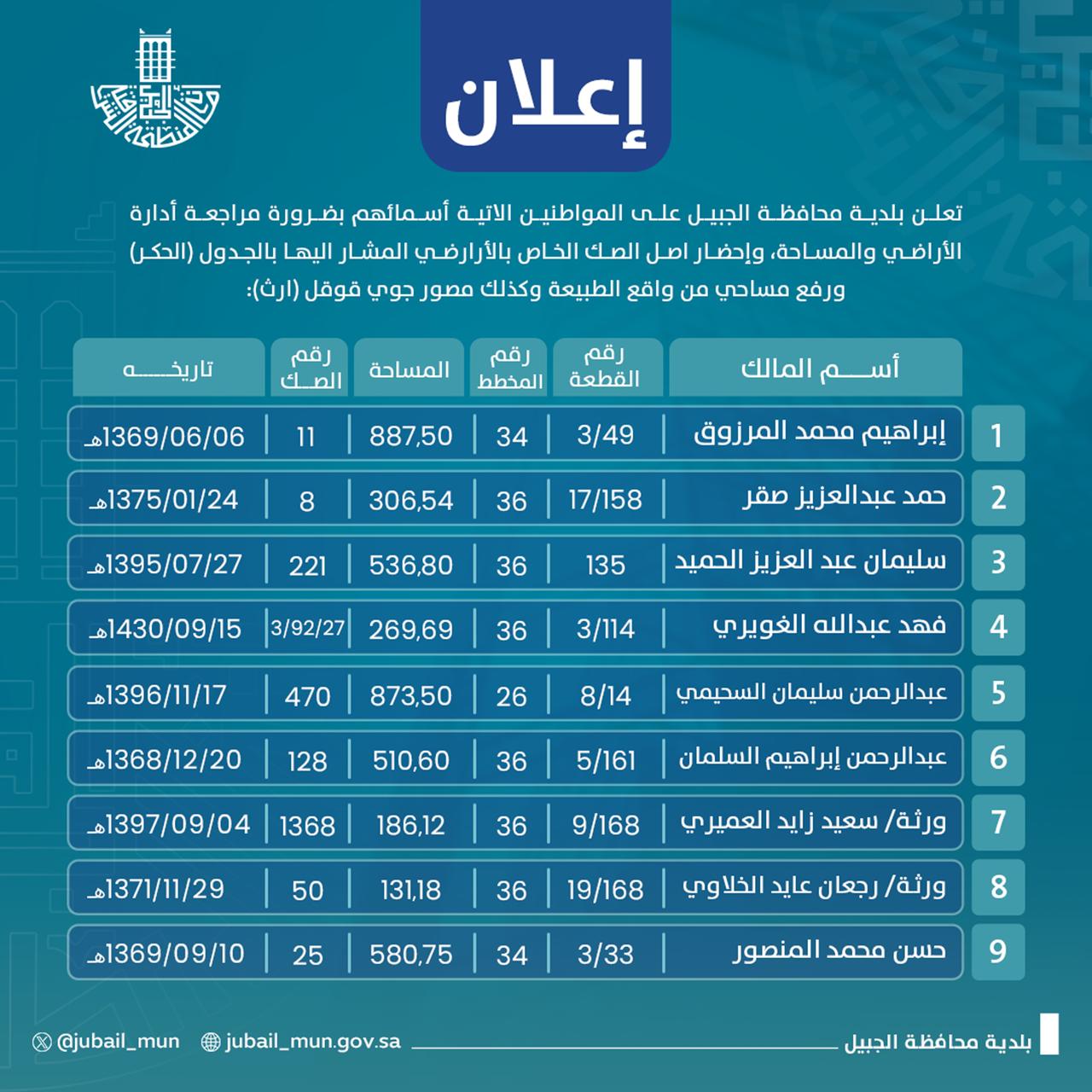 أعلنت بلدية محافظة الجبيل عن ضرورة مراجعة الأسماء التالي لإدارة الأراضي والمساحة في البلدية، وكذلك بإحضار أصل صك الخاص بالأرض المشار اليها بالجدول ( حكر )، ورفع مساحي من واقع الطبيعة، وإضافة إلى صور جوي قوقل (ارث).