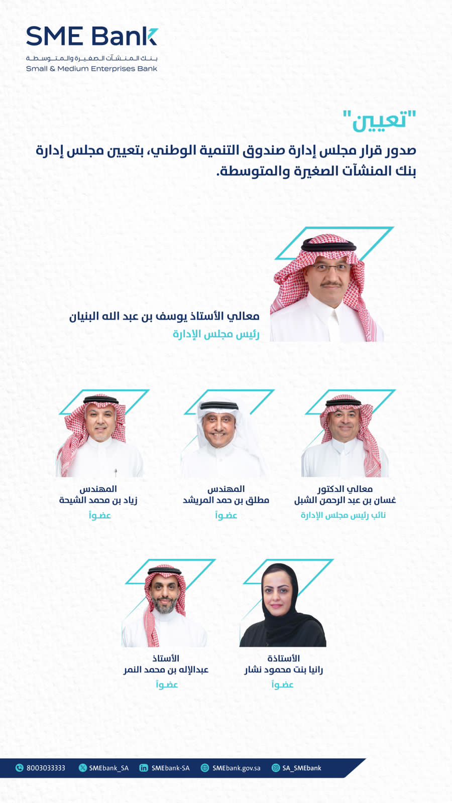 صدر قرار مجلس إدارة صندوق التنمية الوطني بتعيين مجلس إدارة بنك المنشآت الصغيرة والمتوسطة، برئاسة معالي الأستاذ يوسف بن عبدالله البنيان، وعضوية كل من : معالي الدكتور غسان بن عبدالرحمن الشبل، وسعادة المهندس زياد بن محمد الشيحة، وسعادة المهندس مطلق بن حمد المريشد، وسعادة الأستاذة رانيا بنت محمود نشار، وسعادة الأستاذ عبدالاله بن محمد النمر.