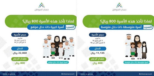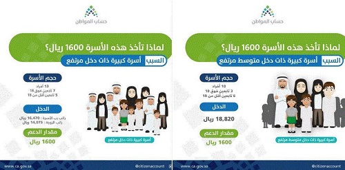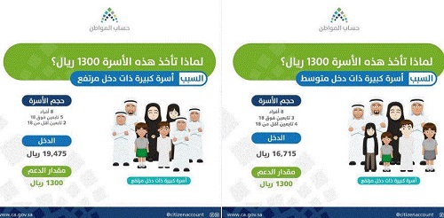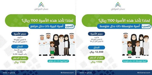 ونشر البرنامج عبر حسابه الرسمي في “تويتر” أشكالاً توضيحية، تبين أن الدخل وحجم الأسرة يتحكمان في تفاوت استحقاق الأسرة، ما بين 800، و1100، و1300، و1600 ريال.