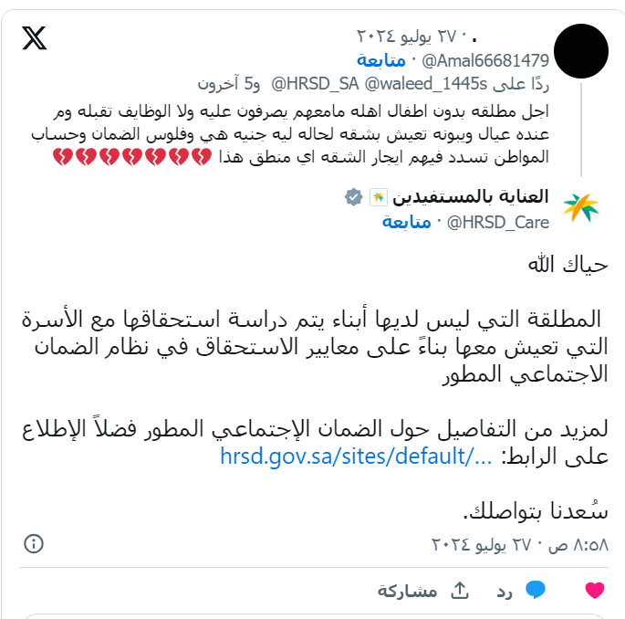 وأضافت الوزارة، عبر حسابها «العناية بالمستفيدين»، أن المطلقة التي ليس لديها أبناء يتم دراسة استحقاقها مع الأسرة التي تعيش معها.