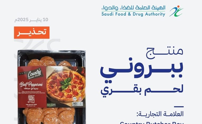 حذّرت الهيئة العامة للغذاء والدواء من منتج ببروني، وهو عبارة عن لحم بقري مجفف للعلامة التجارية (Country Butcher Boy)، “بلد المنشأ دولة الإمارات العربية المتحدة”، وهو معبأ في عبوات بوزن 250 جرامًا، ويحمل تاريخ صلاحية حتى 1 / 3 / 2025م.