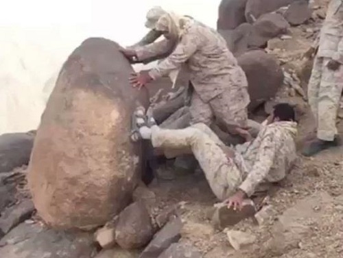 أظهر مقطع فيديو متداول قيام بعض الجنود المرابطين بالحد الجنوبي بإزاحة إحدى الصخور الضخمة التي كان يتحصن بها عناصر الميليشيات الحوثية؛ لتنفيذ عمليات إرهابية.