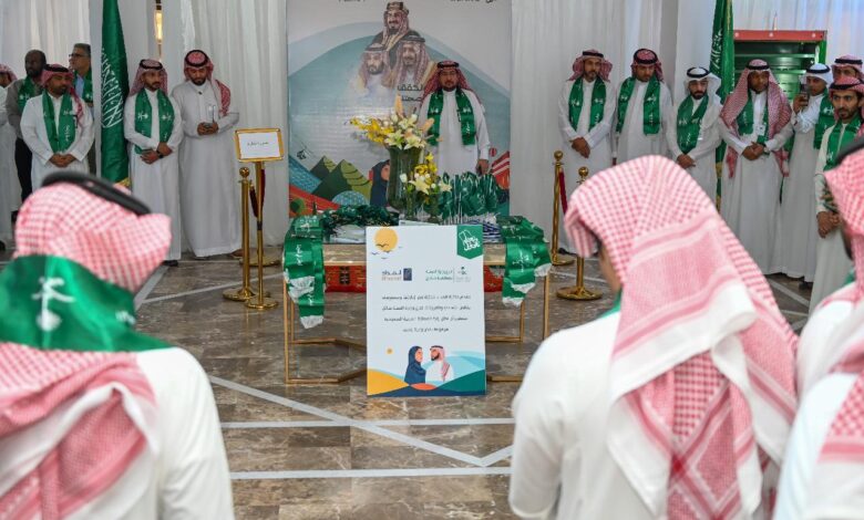 حيث قدم مدير فرع الوزارة سلطان بن ناصر المسيعيد خلال الاحتفال الأوشحة الوطنية والأعلام والورود والهدايا التذكارية للموظفين والموظفات الذين عبروا عن سعادتهم بالمشاركة بهذا اليوم الغالي على الجميع، واختتم الحفل البهيج بالأغاني والأهازيج الوطنية والتي شاركت فيها قيادات الفرع ومنسوبيها .