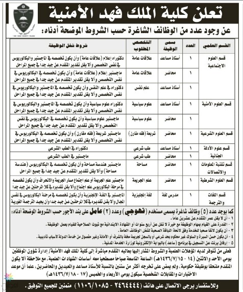 تعلن كلية الملك فهد الأمنية عن توفر وظائف أكاديمية ووظائف بمسمى (قهوجي ، عامل) على بند الأجور ، حيث أن التقديم في مقر كلية الملك فهد الأمنية ( إدارة شؤون الموظفين) يومي الأحد الاثنين 14 – 15 / 7 / 1436هـ الساعة التاسعة صباحاً مع اصطحاب أساسات الشهادات العلمية وستكون المقابلات الشخصية يومي الأربعاء والخميس 17 – 18 / 7 / 1436هـ ، وللاستفسار يرجى الاتصال على هاتف : 2464444 ( تحويله 1085 – 1106) .