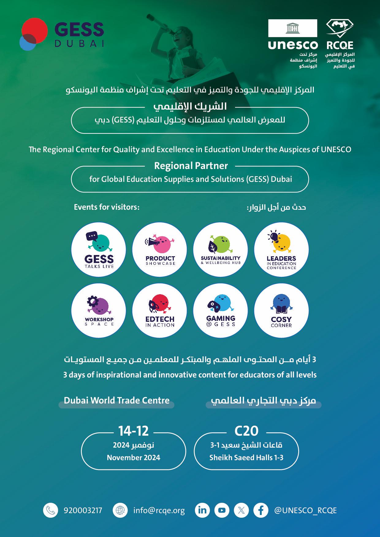 يشارك مركز اليونسكو الإقليمي للجودة والتميز في التعليم في المعرض العالمي لمستلزمات وحلول التعليم (GESS Dubai) الذي يُقام في مركز دبي التجاري العالمي في الفترة من 12 إلى 14 نوفمبر 2024، كشريك استراتيجي يهدف إلى تعزيز جودة التعليم والتميز التربوي في المنطقة.