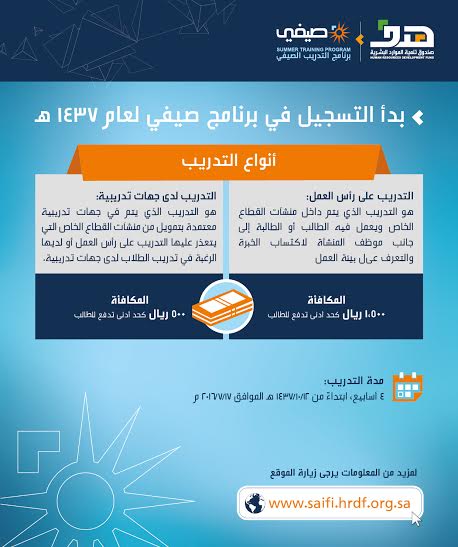 بدأ صندوق تنمية الموارد البشرية (هدف)، في تلقي طلبات الطلاب والطالبات الراغبين الالتحاق في برنامج التدريب الصيفي (صيفي) في منشآت القطاع الخاص والمعاهد والمراكز الأهلية، من خلال الرابط الإلكتروني للبرنامج http://saifi.hrdf.org.sa
