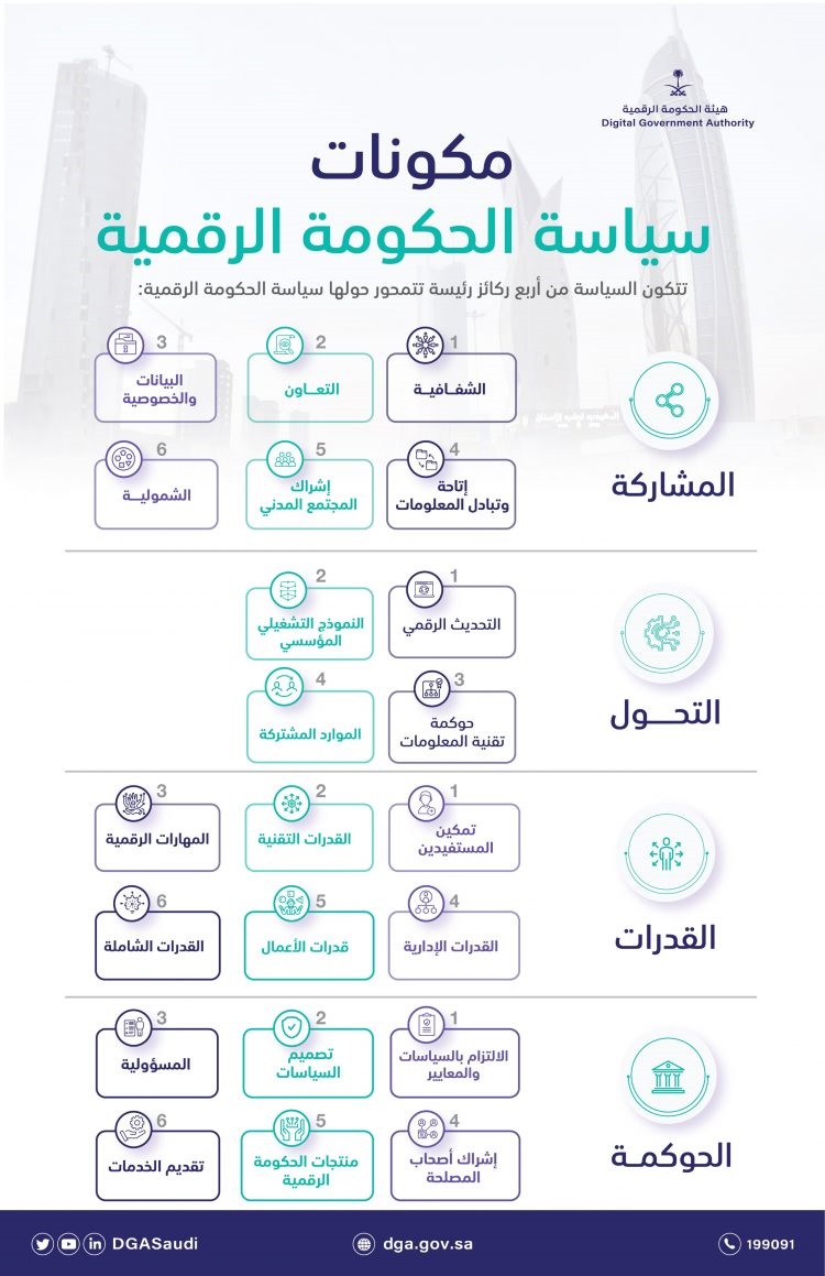 وأوضحت الهيئة في تغريدة لها عبر حسابها الرسمي بموقع تويتر، أن مكونات سياسة الحكومة الرقمية تشمل 4 محاور، الأول المشاركة، ويضم الشفافية والتعاون والبيانات والخصوصية وإتاحة وتبادل المعلومات وكذلك إشراك المجتمع المدني والشمولية.