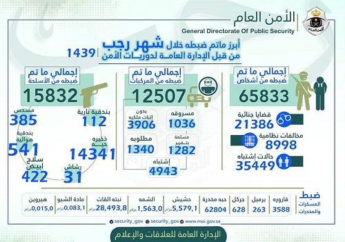 وأوضح الأمن العام أن إجمالي ما تم ضبطه من أشخاص خلال شهر رجب بلغ 65833 شخصاً ما بين موقوف في قضايا جنائية أو مخالفات نظامية أو حالات اشتباه، كما ضبطت 12507 سيارات ما بين مسروقة أو مطلوبة أو مشتبه بها أو بدون إثبات ملكية أو مسلمة بتقرير.
