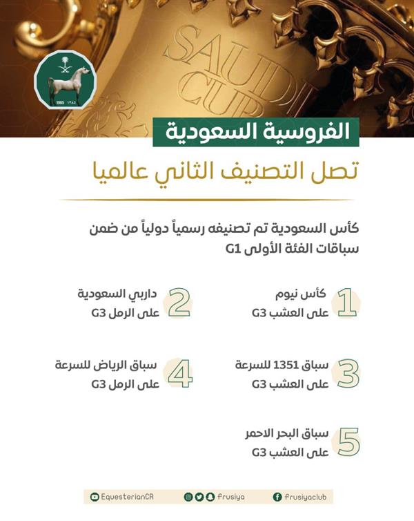 ارتفعت “الفروسية السعودية” إلى التصنيف الثاني عالميًا، كما تم تصنيف كأس السعودية دوليًا ضمن سباقات الفئة الأولى G1.