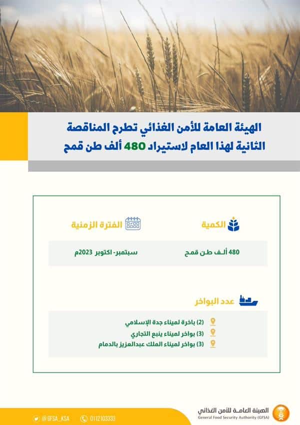 أعلنت الهيئة العامة للأمن الغذائي اليوم (الخميس) طرح المناقصة الثانية لاستيراد القمح لهذا العام، وذلك لكمية 480 ألف طن للتوريد خلال الفترة من سبتمبر – أكتوبر 2023م.