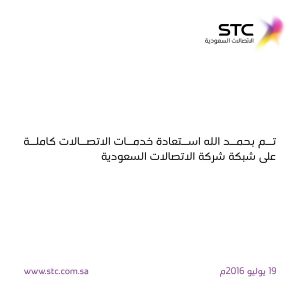 أعلنت شركة الاتصالات السعودية عن استعادتها لخدمات الاتصالات كاملة على الشبكة إثر تعطل أحد أنظمتها مما تسبب في فقدان عدد من العملاء إمكانية الاتصال بالشبكة.