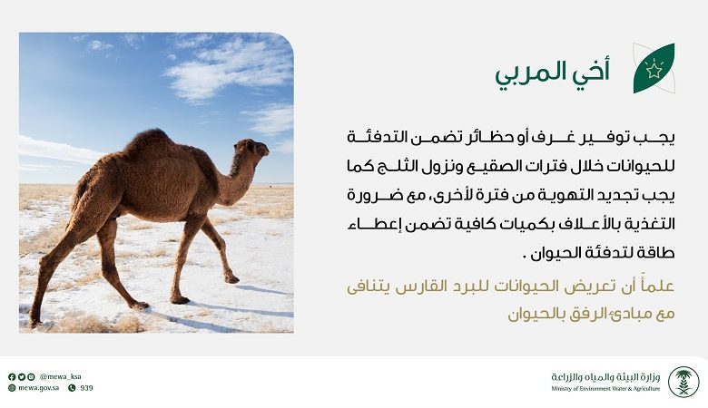 وجهت وزارة البيئة والمياه والزراعة، نصيحة لمربي الإبل بحمايتها خلال فترات البرد وعدم تعريضها للثلوج.