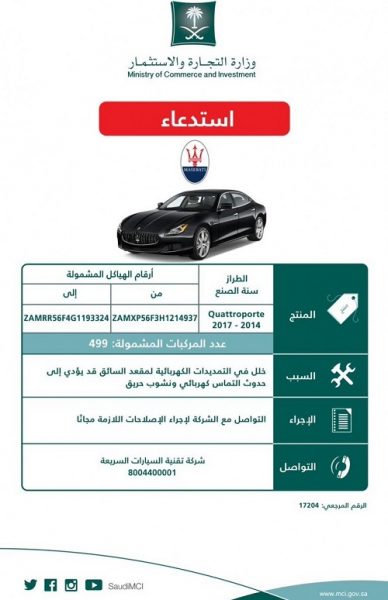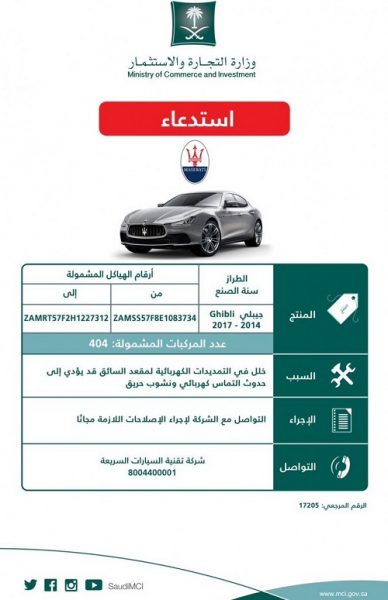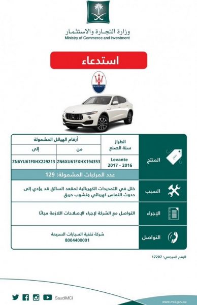 أعلنت وزارة التجارة والاستثمار اليوم الجمعة عن استدعاء 1032 مركبة “مازيراتي” 2014-2017 لخلل بالتمديدات الكهربائية لمقعد السائق قد يؤدي لحدوث التماس كهربائي ونشوب حريق، وطالبت الوزارة المستهلكين بضرورة التواصل مع الوكيل المعتمد في المملكة ( شركة تقنية السيارات السريعة ) وإجراء الاصلاحات اللازمة مجاناً.. وذلك حسبما أعلنت الوزارة عبر حسابها الرسمي في موقع التواصل الاجتماعي “تويتر”.