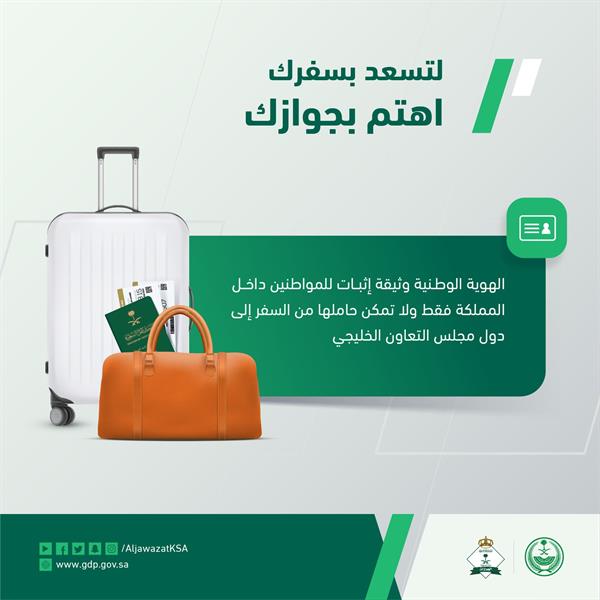 وذكرت المديرية أن الهوية الوطنية وثيقة إثبات للمواطنين داخل المملكة فقط، ولا تُمكّن حاملها من السفر إلى دول مجلس التعاون الخليجي، مشددة على ضرورة التأكد قبل السفر من أن المدة المتبقية في جواز السفر لا تقل عن 3 أشهر للدول العربية و6 أشهر للدول الأخرى.