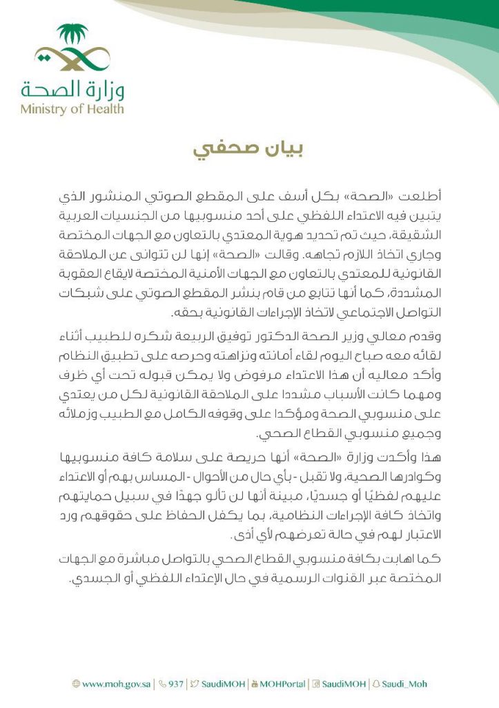 وأضاف البيان أن الوزارة تعمل حالياًً على متابعة الشخص الذي نشر التسجيل الصوتي على شبكات التواصل الاجتماعي، من أجل اتخاذ الإجراءات النظامية بحقه.