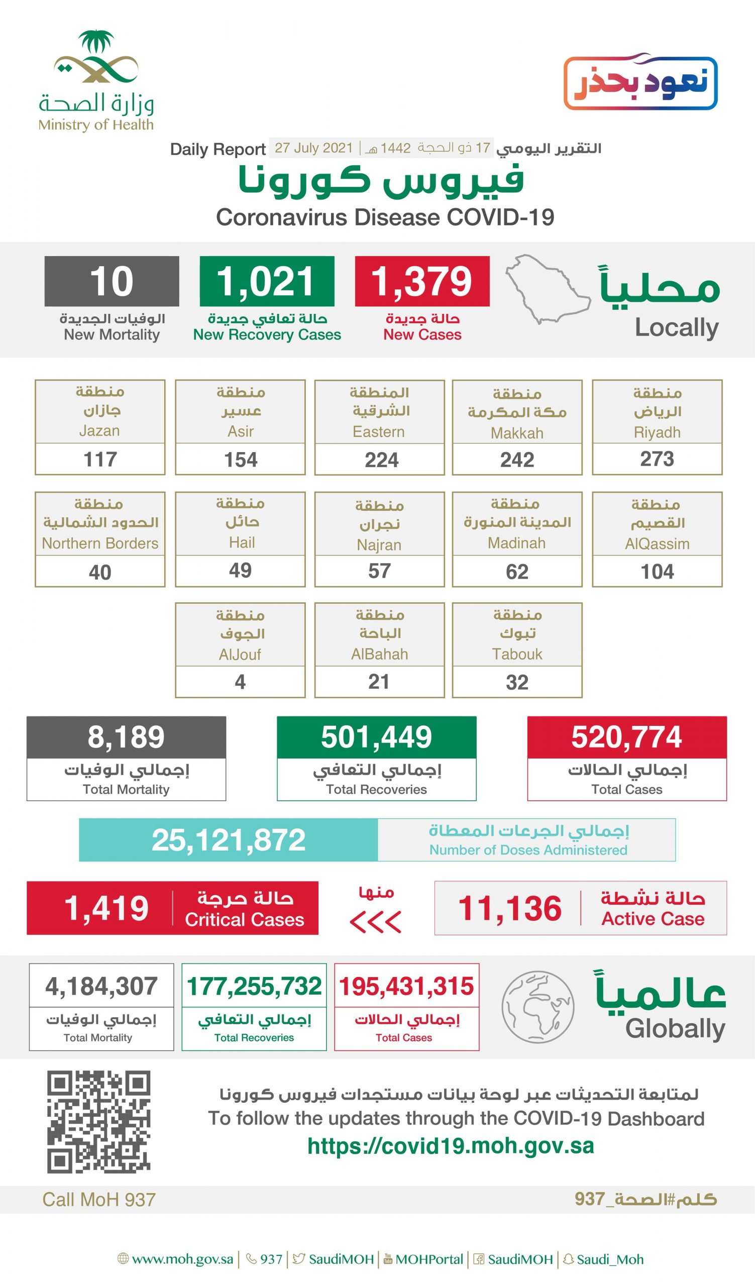أعلنت وزارة الصحة، اليوم الثلاثاء 27 يوليو 2021، تسجيل 1379 حالة إصابة جديدة بفيروس كورونا الجديد (كوفيد-19)، ليصبح الإجمالي 520774 حالة.