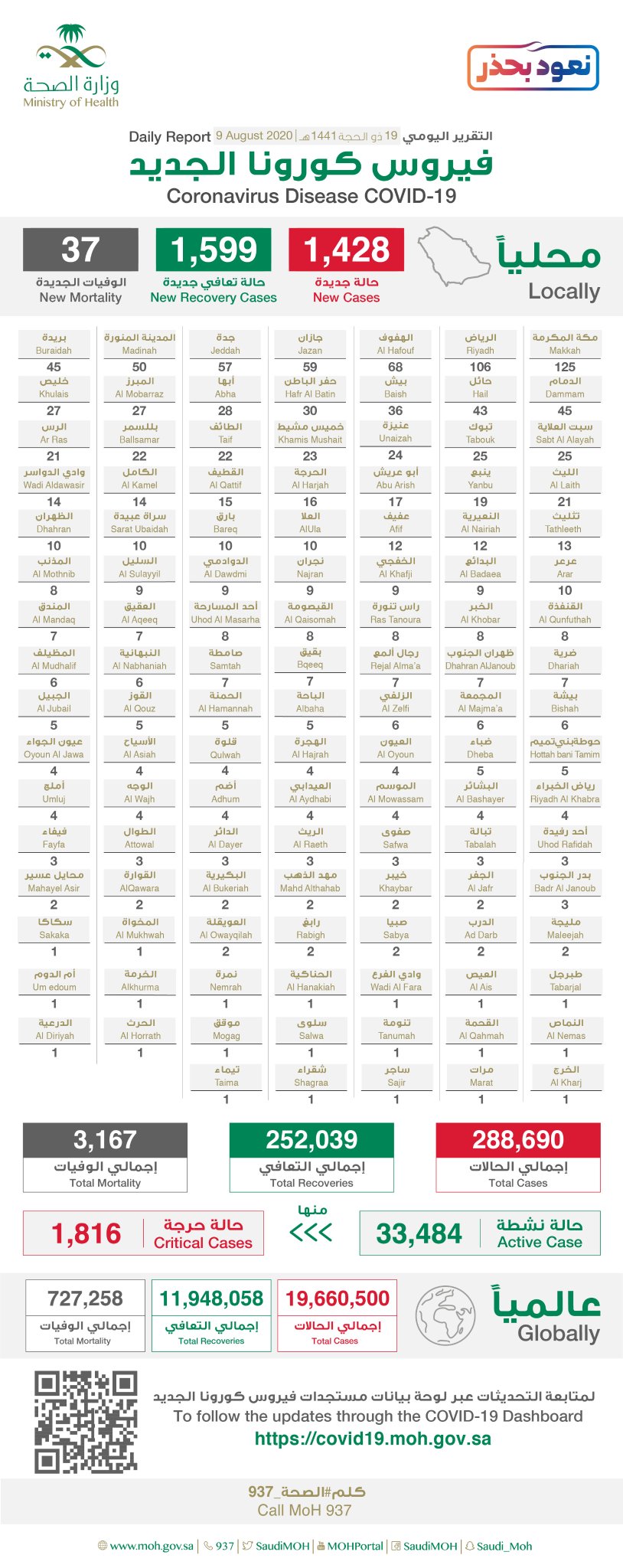 أعلنت وزارة الصحة، اليوم الأحد 09 أغسطس 2020، تسجيل 1599 حالة تعاف جديدة من فيروس كورونا الجديد (كوفيد-19) ليصبح الإجمالي 252039 حالة ولله الحمد.