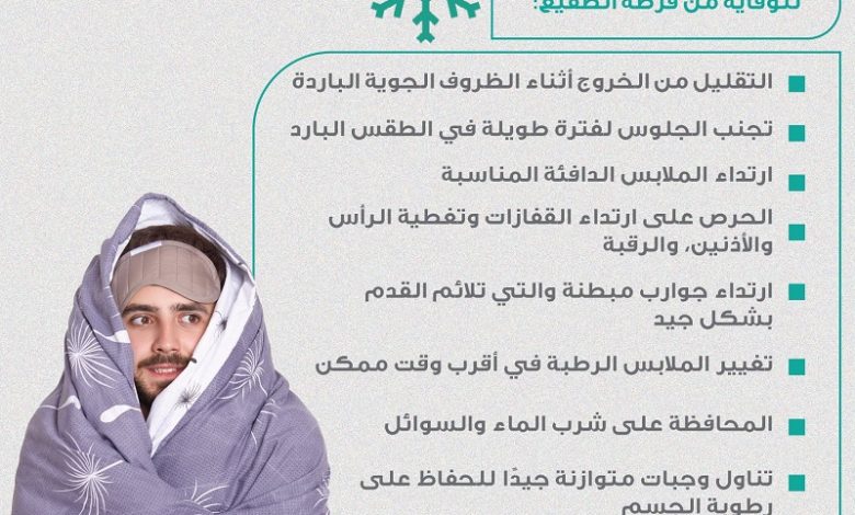 نبه المجلس الصحي السعودي من التعرض لقرصة الصقيع، تزامنًا مع الاستمرار في انخفاض درجات الحرارة بالمملكة، مشيرًا إلى ضرورة زيارة الطبيب عند ظهور ثلاث علامات.