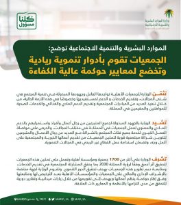 وتؤكد الوزارة بأنها تشرف على أكثر من 1700 جمعية ومؤسسة أهلية وتعمل على تمكين هذه الجمعيات لتحقيق أثر أعمق وفقًا لرؤية المملكة 2030 بما يحقق المشاركة المجتمعية في تقديم الخدمات، كما تقوم الوزارة بمتابعة ودعم وتطوير هذه الجمعيات بهدف تحقيق الدور التنموي لتمكين المستفيدين من خدماتها وذلك من خلال البرامج والمبادرات التنمويـة في المجتمع، والتي تقوم بالدعم والتدريب والتأهيل، كما تقوم الوزارة كجهة مختصة بالإشراف الإداري والمالي على الجمعيات والمؤسسات الأهلية بعد الترخيص لها ومتابعتها وفق إطار حوكمة ينظم أعمالها ويهدف إلى تقويمها من خلال زيارات ميدانية وتقارير دورية للتحقق من مدى التزامها بالأنظمة و المعايير ذات العلاقة، إضافة إلى قيام الوزارة بالتدقيق المحاسبي على الأنظمة والقوائم المالية للجمعيات بشكل ربع سنوي لحين إصدار القوائم المالية في نهاية العام المالية بما يحقق الإفصاح و الشفافية المطلوبة، ويتضح ذلك من خلال آخر تقييم لمستوى الحوكمة والذي يشمل تقييم السلامة المالية والامتثال والالتزام والشفافية والافصاح، والذي نفذ خلال عام 2019م وينفذ بشكل دوري في كل عام.