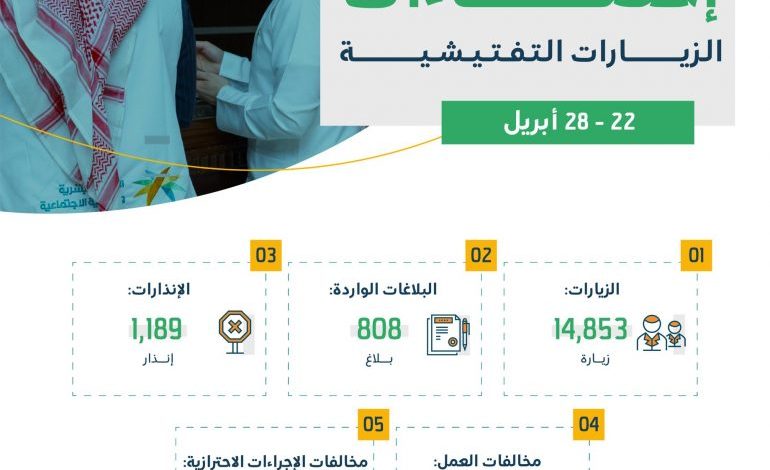 نفذت فرق الرقابة الميدانية بوزارة الموارد البشرية والتنمية الاجتماعية 14,853 زيارة رقابية على منشآت القطاع الخاص في مختلف مناطق المملكة وذلك خلال الفترة من 22 إلى 28 إبريل، للتأكد من التزام أصحاب المنشآت بالقرارات والتشريعات الصادرة عن الوزارة لتنظيم سوق العمل وضبط المخالفات ومتابعة امتثال المنشآت للإجراءات الاحترازية والتوجيهات الصادرة في هذا الخصوص.
