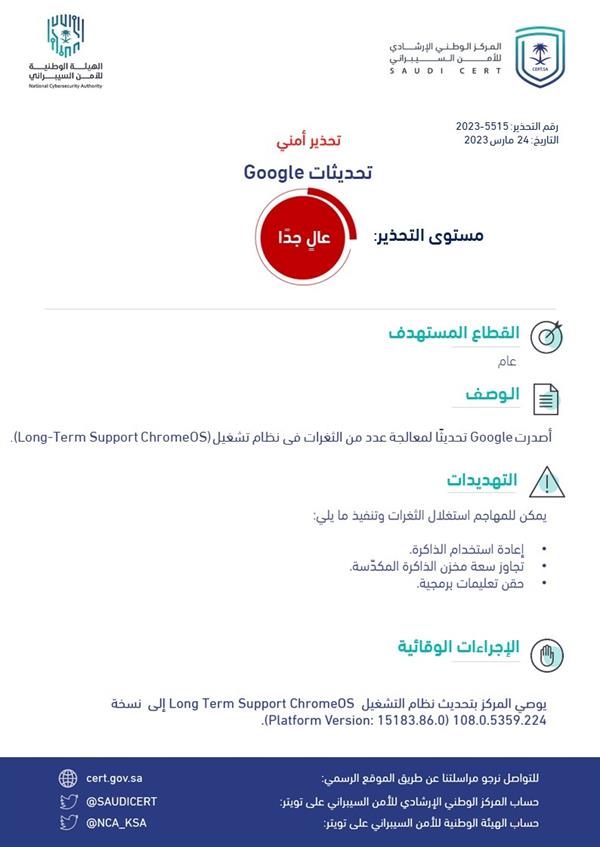 وأوصى بتحديث نظام تشغيل (Long-Term Support ChromeOS) إلى نسخة (108.0.5359.224(Platform Version: 15183.86.0، وذلك كإجراء وقائي من هذه التهديدات.
