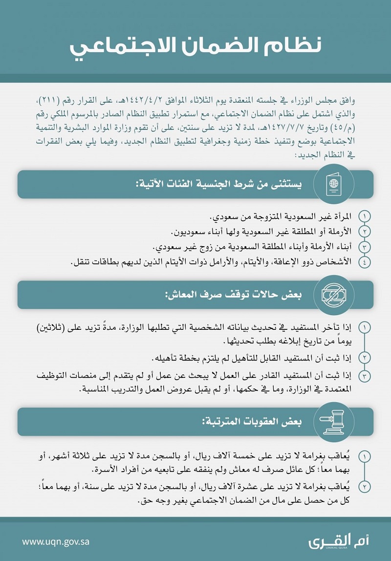 وكان مجلس الوزراء قد وافق في جلسته المنعقدة يوم الثلاثاء الموافق 2/4/1442هـ على القرار رقم 211 والذي اشتمل على نظام الضمان الاجتماعي، مع استمرار تطبيق النظام الصادر بالمرسوم الملكي رقم (م/45) وتاريخ 7/7/1427هـ لمدة لا تزيد على سنتين، على أن تقوم وزارة الموارد البشرية والتنمية الاجتماعية بوضع وتنفيذ خطة زمنية وجغرافية لتطبيق النظام الجديد.