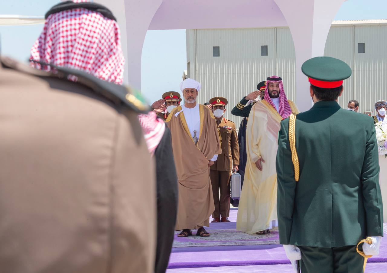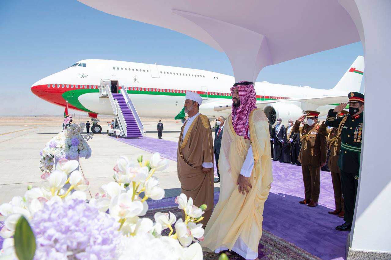 وكان ولي العهد، الأمير محمد بن سلمان قد استقبل سلطان عُمان لدى وصوله مطار خليج نيوم، حيث أجريت له مراسم استقبال رسمية، واصطحبه بعد ذلك للقاء خادم الحرمين.