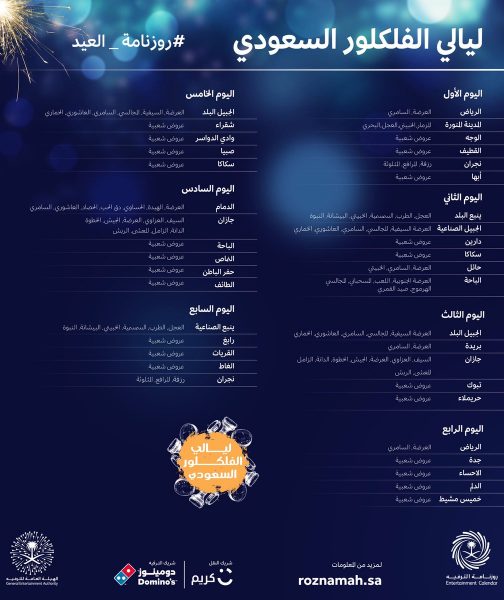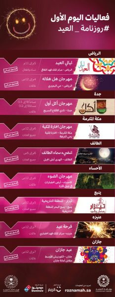 هذا وستقام العديد من الفعاليات المتنوعة في أول أيام عيد الفطر وتستمر حتى السابع، حيث ستقام العرضة السعودية في عدد من المدن