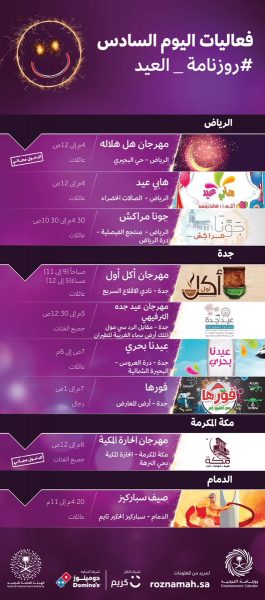 سادس أيام العيد في ( الواجهة البحرية بكورنيش الدمام ، وفي القرية التراثية بجازان ، وفي منتزه الأمير مشاري في الباحة ، وفي النماص في منتزه الملك فهد بحفر الباطن ، وفي منتزه الردف في الطائف ).