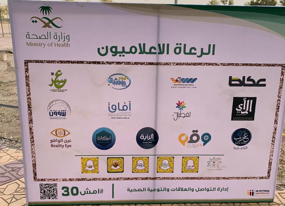 وفي نفس السياق دشن رئيس مركز عفراء جايز بن سعيد الأكلبي نيابةً عن محافظ بلقرن الدكتور عبدالرحمن بن عبدالله ال حامد عصر اليوم حملة المشروع الوطني للمشي تحت شعار امش30 وذلك بشارع الإبداع، ونظم الحملة القطاع الصحي بالمحافظة ممثلاً في مستشفى سبت العلاية وقطاع الرعاية بالعلاية تنفيذاً لتوجيهات سعادة مدير صحة بيشة فالح بن ناصر الشهراني.