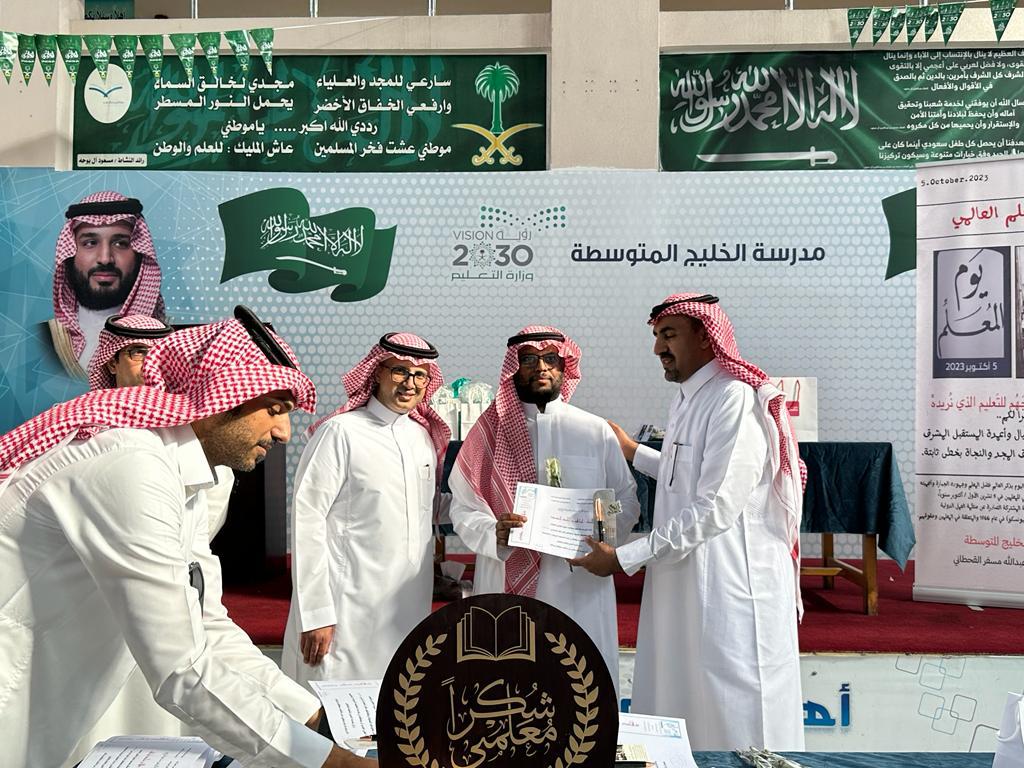 كما شهدت متوسطة الأمير سعود بن جلوي وابتدائية سعيد ابن العاص، ومتوسطة الخليج، مشاركة المشرف العام على العلاقات والإعلام بوزارة التعليم صالح الثبيتي، حيث شهد زيارة المعلمين في فصولهم وتكريمهم بمشاركة طلابهم وإدارة المدرسة.