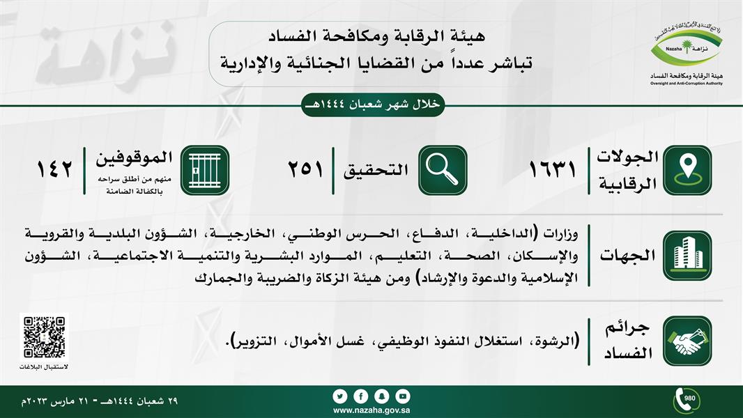 أعلنت هيئة الرقابة ومكافحة الفساد “نزاهة” اليوم (الثلاثاء)، أنها باشرت عددا من القضايا الجنائية والإدارية خلال شهر شعبان 1444 هجرية.