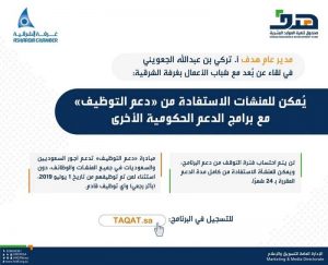 وبيّن الجعويني خلال اللقاء أن مبادرة “دعم التوظيف” تدعم أجور السعوديين والسعوديات في جميع المنشآت والوظائف، دون استثناء لمن تم توظيفهم من تاريخ 1 يوليو 2019، (بأثر رجعي) بالإضافة إلى أي توظيف قادم، ولمدة سنتين وفق ضوابط المبادرة.
