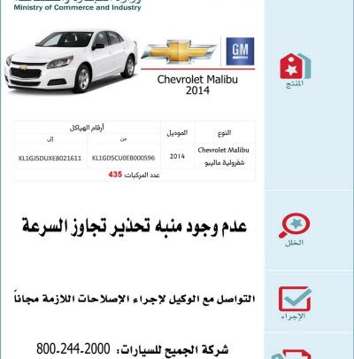 أعلنت وزارة التجارة والصناعة عن استدعاء “435″ سيارة من نوع “شفرولية/ ماليبو” موديل 2014. وذكرت الوزارة أن سبب استدعاء هذه السيارات يعود لعدم وجود منبه تحذير تجاوز السرعة. كما دعت وزارة الجارة والصناعة جميع مالكي هذا النوع من السيارات إلى التواصل مع الوكيل وذلك لإجراء الإصلاحات اللازمة مجاناً.