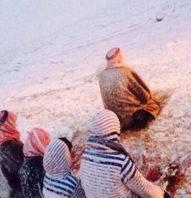 تداول أصحاب مواقع التواصل الاجتماعي، صورة لأب وأبنائه يؤدون الصلاة أثناء تساقط الثلوج في منطقة مكشوفة بمحافظة القريات، في منطقة الجوف.