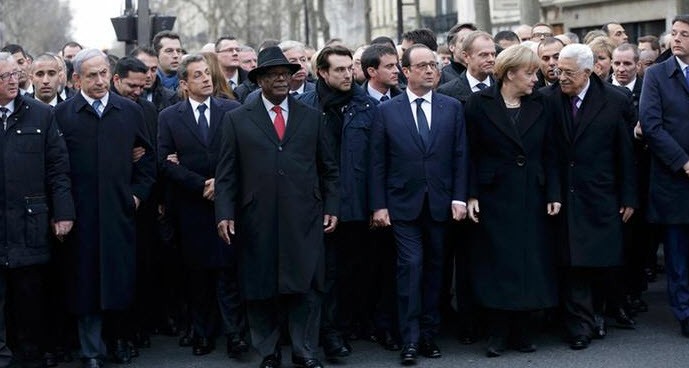 ومن أبرز الزعماء المشاركين، في المسيرة، العاهل الأردني الملك عبد الله الثاني وقرينته، والمستشارة الألمانية “أنجيلا ميركل”، ورئيس الوزراء البريطاني “ديفيد كاميرون”، ونظيراه الإيطالي “ماتيو رينزي”، والإسباني “ماريانو راخوي”، ورئيس مفوضية الاتحاد الأوروبي “جان كلود يانكر”، والرئيس الأوكراني “بيترو بوروشينكو”.