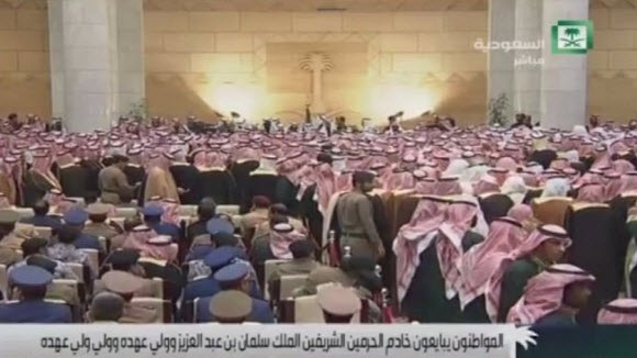 استقبل خادم الحرمين الشريفين الملك سلمان بن عبدالعزيز آل سعود وصاحب السمو الملكي الأمير مقرن بن عبدالعزيز آل سعود ولي العهد نائب رئيس مجلس الوزراء وصاحب السمو الملكي الأمير محمد بن نايف بن عبدالعزيز ولي ولي العهد النائب الثاني لرئيس مجلس الوزراء وزير الداخلية، بعد صلاة العشاء لهذا اليوم الجمعة 3 ربيع الآخر 1436 هـ في قصر الحكم بالرياض، أصحاب السمو الملكي الأمراء وسماحة مفتي عام المملكة وأصحاب الفضيلة العلماء والمعالي الوزراء وكبار المسؤولين من مدنيين وعسكريين وجموعاً غفيرة من المواطنين ،الذين قدموا البيعة على كتاب الله وسنة رسوله صلى الله عليه وسلم لخادم الحرمين الشريفين الملك سلمان بن عبدالعزيز آل سعود ملكا للمملكة العربية السعودية ولصاحب السمو الملكي الأمير مقرن بن عبدالعزيز آل سعود وليا للعهد ولصاحب السمو الملكي الأمير محمد بن نايف بن عبدالعزيز وليا لولي العهد.
