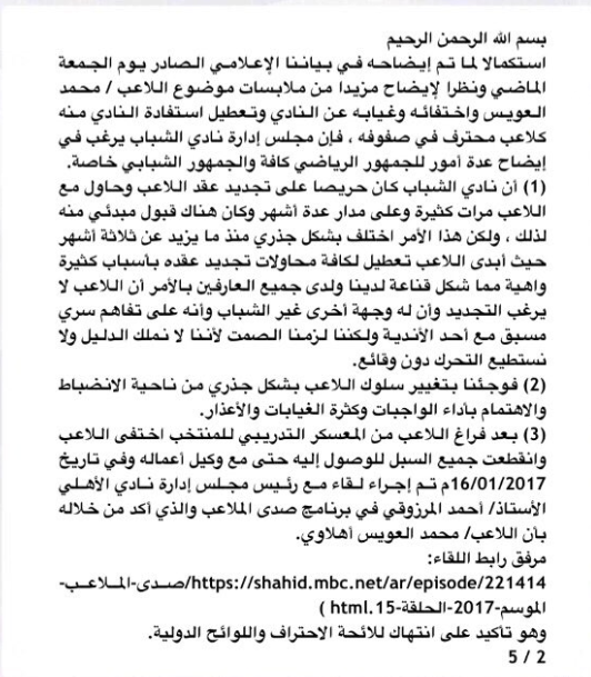 وقال الشباب إنه التزم الصمت في حينه لعدم وجود الدليل، وأشار إلى أنه تفاجأ باختفاء اللاعب منذ انتهاء معسكر المنتخب التدريبي في أبو ظبي، وانقطعت سبل التواصل معه حتى من وكيل أعماله، وأنه في تاريخ 16/1/2017، تم إجراء لقاء مع أحمد المرزوقي رئيس الأهلي في احد البرامج الرياضية وأكد من خلاله أن اللاعب العويس أهلاوي، وأرفق الشباب في بيانه رابطا للقاء، مشددا على أن ذلك الأمر يعد انتهاكا للائحة الاحتراف واللوائح الدولية.